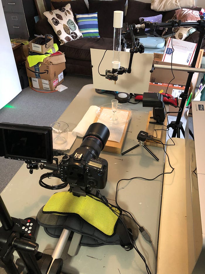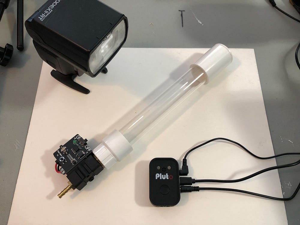 The water drop release, flash, and camera shutter are all coordinated through the Pluto Trigger.