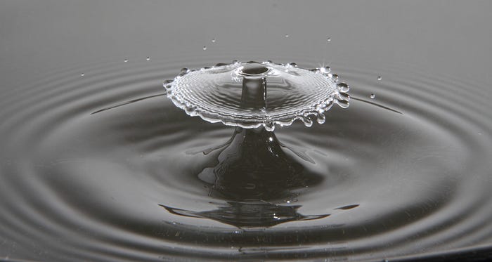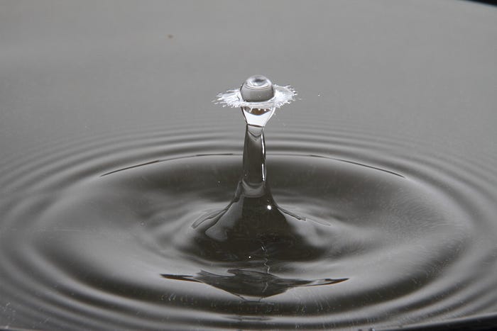 In the above image, the second drop is on the way down and about to meet up with the original drop that is rebounding back out of the water container.